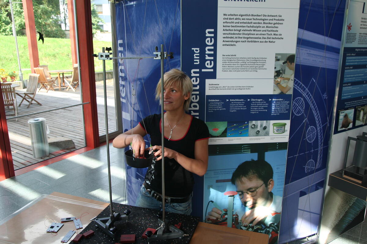 An Klettverschluss-Versuchsapparaturen können die Jugendlichen zwei unterschiedliche Klettverschlusstypen, den Haken- und den Pilzkopfband-Klettverschluss auf ihre Haftkraft testen. Durch Auflegen der Gewichte auf einen Teller ermitteln die Schüler wie viel Gewicht jeder Klettverschluss tragen kann. Über die Auswertung des Versuches sollen Gesetzmäßigkeit erkannt werden. Gibt es Unterschiede in der Haftkraft zwischen Haken und Pilzkopfband-Klettverschlüssen? Wovon hängt die Haftkraft genau ab und wie unterscheiden sich Zug- und Scherkräfte?